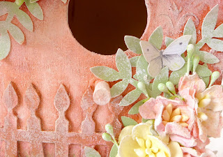 Farby mi pripadali až moc sýte, chcela som, aby boli jemnejšie. Tak som vzala opäť biele gesso a keďže som nemala ani jeden čistý tupovač, siahla som po obyčajnej kuchynskej hubke na riad. Jemne som si hubku namočila v gesse, pár krát otlačila na búdku a potom celou plochou poriadne rozotrela. Gesso som naniesla všade, na celú búdku, plot, čipky, listy aj kvety: